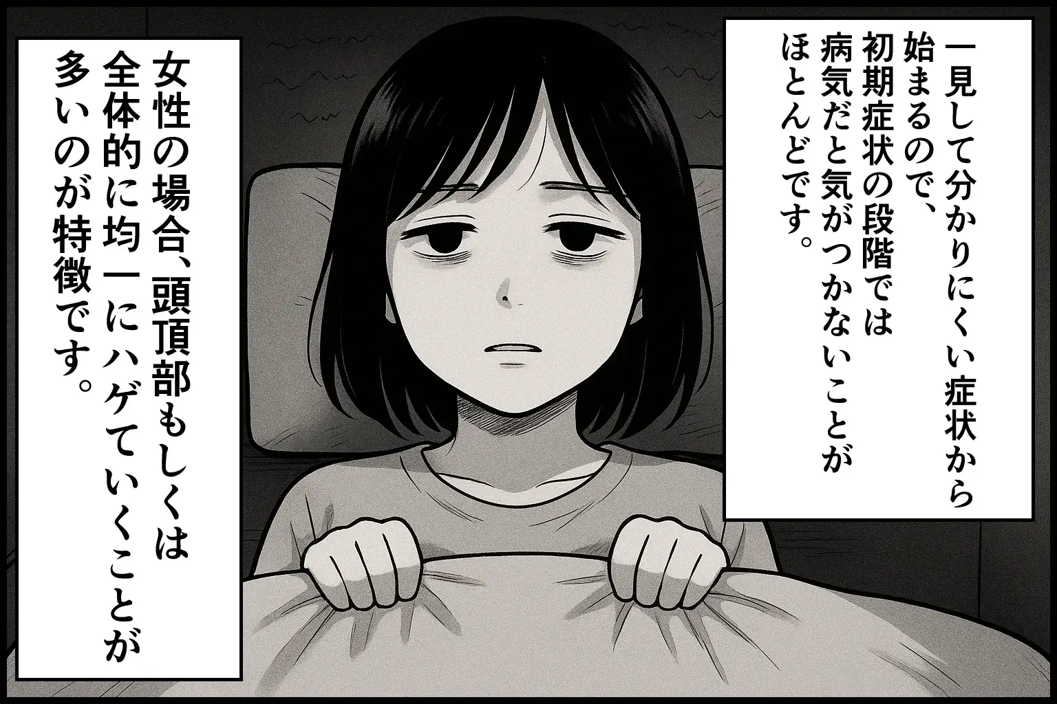 女性の脱毛は、ホルモンバランスの乱れや加齢、ストレスなど複数の要因が重なって起こるのが特徴です。